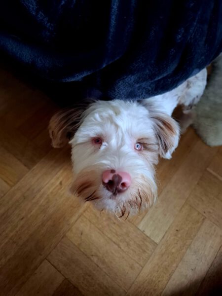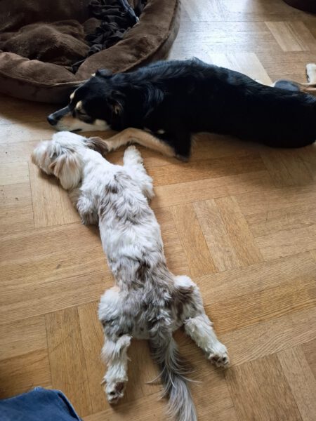 Manchmal, wenn ich ein für mich noch unbekanntes Geräusch höre, welches ich nicht zuordnen kann, dann belle ich mich so in Rage, dass es ein paar Minuten dauert, bis ich mich beruhigt habe. Aber mit der Zeit kenne ich immer mehr und es erschreckt mich nicht mehr so viel. Ich brauche eben etwas Zeit um anzukommen. Ich gehe sehr gerne spazieren und hinterlasse dabei auch fleißig meine Duftmarken. Ich darf mit Pflegefrauchen jeden Tag ins Büro zur Arbeit. Da ist immer viel los und ich bin mittags dann auch echt platt.